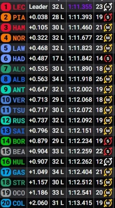Ferrari aguantó el pulso después de que Charles liderase los tres entrenamientos libres, ya no era el clásico viernes pintón de Maranello, pero el arreón final de McLaren, esperado, fue suficiente. Había ya un escalón entre Piastri (a 0.175 de la cabeza) y Sir Lewis (0.428), aunque Hamilton perdió ese cuarto puestos por un claro y caro impeding a Verstappen en la Q1, así que el holandés heredó esa segunda fila por delante del mejor RB de la temporada, Hadjar, que con un puñado de actuaciones así volverá a prender la mecha del debate sobre los segundos pilotos de Red Bull.