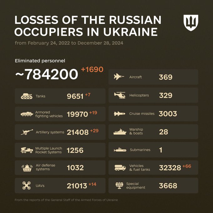 Pérdidas en combate del enemigo desde el 24 de febrero de 2022 hasta el 29 de diciembre de 2024.