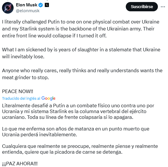 Musk juega con la idea de cortar el servicio de Starlink para el ejército ucraniano y hacer colapsar el frente a favor de Rusia En otras palabras, se suma a la presión de Trump para que Ucrania capitule y firme el acuerdo económico para transferirle a EEUU sus recursos naturales