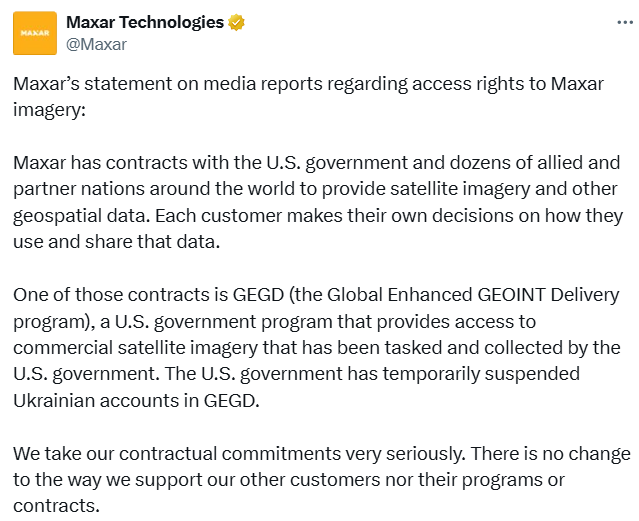 Trump ya le ordenó a la compañía privada de EEUU Maxar que le corte a Ucrania el servicio de imágenes satelitales de alta definición que usaba para planificar sus ofensivas, ataques artilleros y evaluar resultados Las sanciones militares contra Ucrania son cada vez mas duras