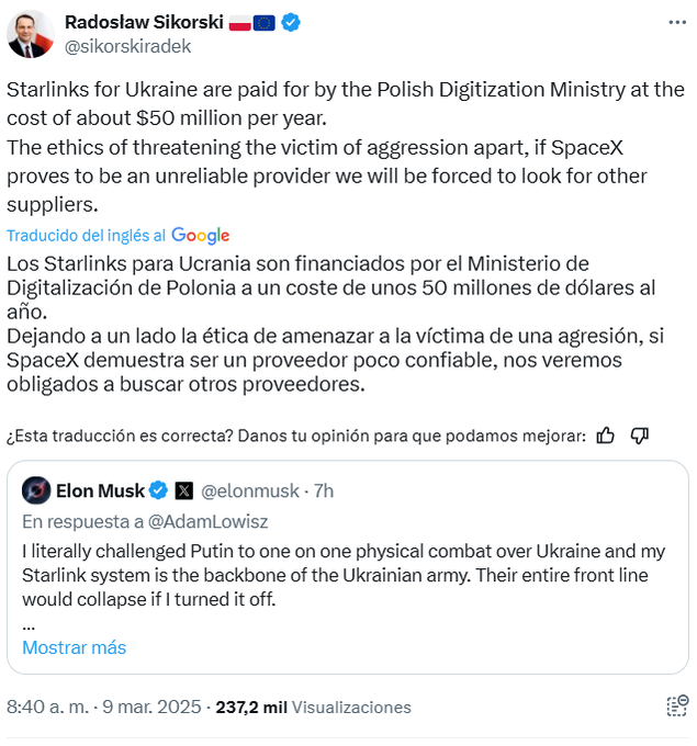 El ministro de Relaciones Exteriores de Polonia salió a recordarle a Musk que el servicio de Starlink para Ucrania fue contratado y pagado por su país En su amenaza, el dueño de Starlink está apostando mucho capital en contratos en Europa y otros sitios y es algo que ya sabía