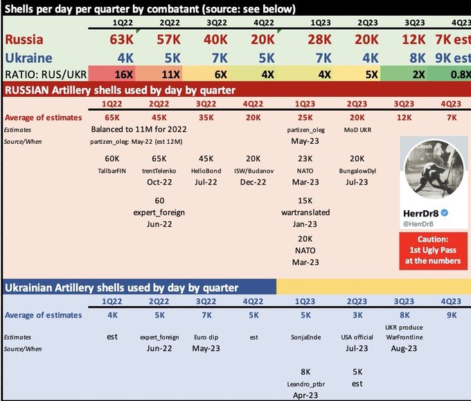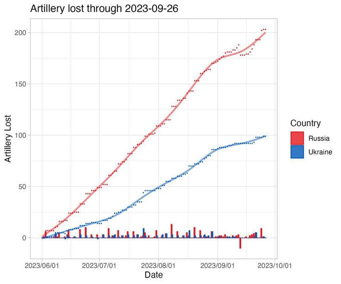 #OBMtriangleArty The data just keeps piling up regarding Russia losing the artillery war; incredible, given the MASSIVE advantage Russia began the war with relative to Ukraine and Russia historic comparative advantage. Good chart from @verekerrichard1 today. @ragnarbjartur… twitter.com/verekerrichard…