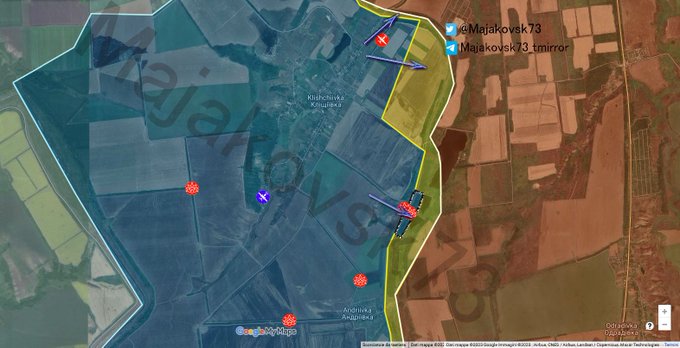 En Klischiivska, Ucrania sobrepasó el terraplén del ferrocarril al este de la localidad que por su posición elevada era una línea defensiva natural para los rusos. El regreso de las tropas de Wagner a la zona, ahora bajo liderazgo estatal, no impidió el avance ucraniano mapa