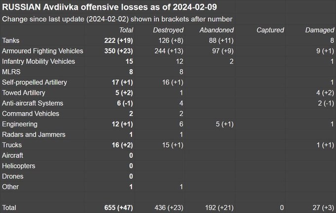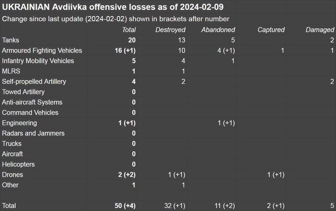 basado en un documento publicado por @naalsio26, las pérdidas rusas desde que comenzara la ofensiva sobre Avdiívka en octubre de 2023 son espeluznantes, sumando más de 650 carros de combate, vehículos blindados y demás. Del lado ucraniano, las pérdidas parecen prácticamente despreciables, reflejando una relación de bajas que sería de 13 a 1 a favor de las Fuerzas Armadas de este país. Es decir, que la estrategia ucraniana destinada a defenderse en esta zona, creando una «kill-zone» para los rusos, podría parecer a priori acertada.