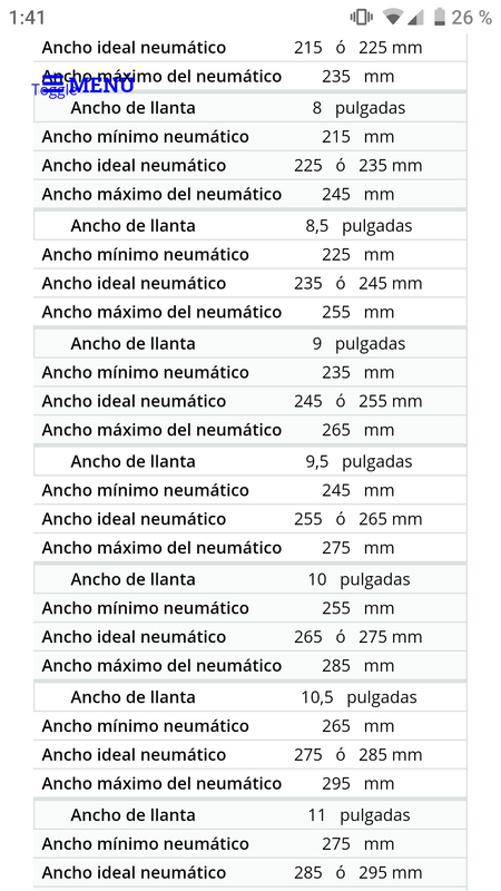 Te dejo la tabla de ancho de llantas para neumáticos.