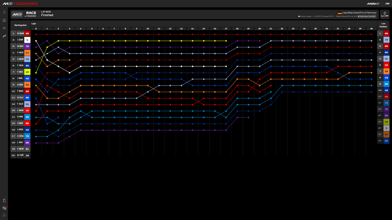 Márquez atrapaba a Quartararo y le arrebataba la segunda posición a seis del final, teniendo un gran susto instantes después; lo que permitía a Bezzecchi elevar su ventaja a 1,7 segundos. El italiano intentaba apretar los dientes, pero