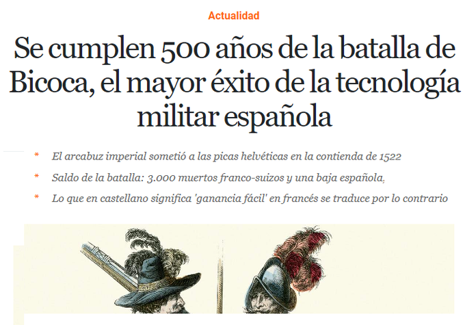 Hace 500 años tuvo lugar la Batalla de Bicoca, un pueblo de Italia junto a Milán 3.000 españoles con mejores tácticas y armas y casi sin bajas derrotaron a 15.000 franco-suizos Desde entonces, en español bicoca es un beneficio fácil. En francés, bicoque es algo mal pertrechado.
