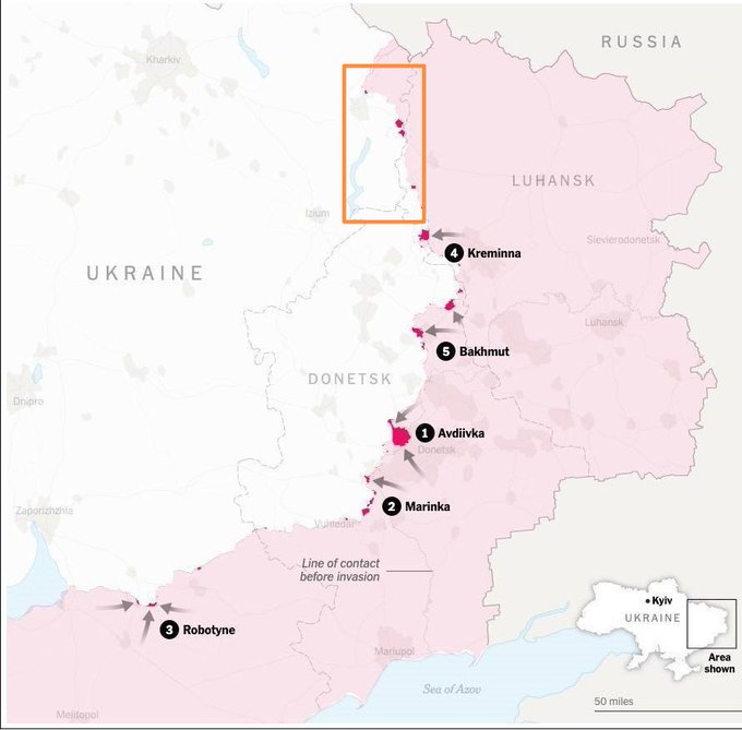 En cuanto a los combates y movimientos, que como puede verse en el tuit sobre estas líneas, son intensos a tenor del número de pérdidas. En las últimas horas han afectado al oeste de Bakhmut, tanto al área de Bohdanivska como a Ivanivske. Lo más preocupante para los ucranianos es que al gran número de ataques artilleros y bombardeos aéreos rusos no parecen corresponderle apenas respuestas por parte de la artillería ucraniana (