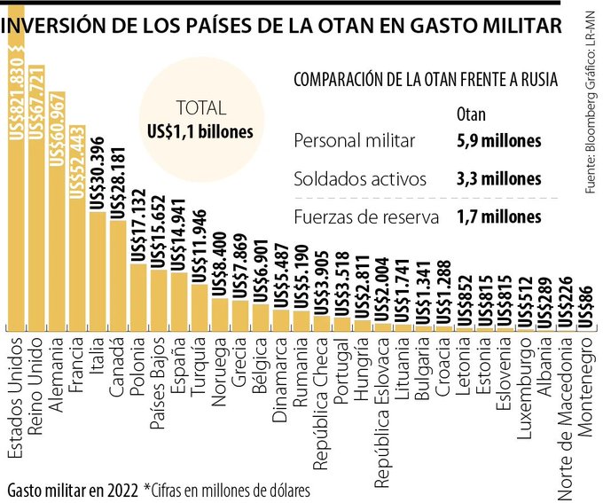 en la OTAN existen sensibilidades muy diferentes respecto al peligro que Rusia plantea-, de firmeza en las medidas a adoptar y de estrategias de salida para el conflicto ucraniano, que por cualesquiera otros factores, incluyendo las aspiraciones rusas o sus capacidades, por más que estas no dejen de crecer a medida que reconstituyen sus Fuerzas Armadas y adoptan soluciones a las lecciones aprendidas durante la guerra.