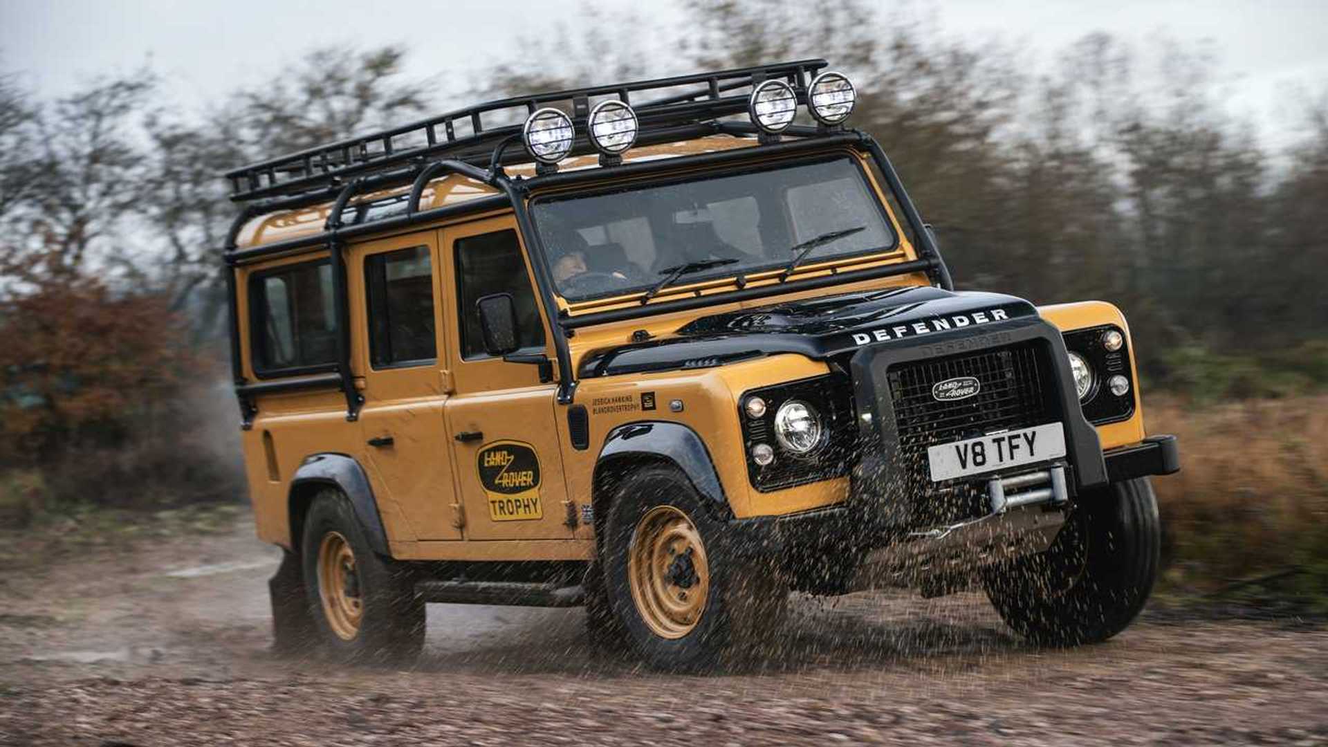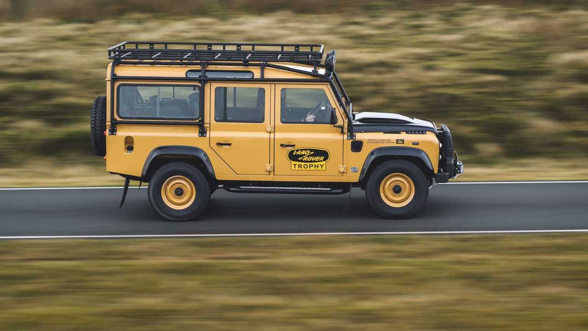 Veinticinco ejemplares del Defender Works V8 Trophy, en una mezcla de diseños de carrocería Station Wagon 90 y 110, tendrán un acabado exclusivo en un color de pintura Eastnor Yellow único con rines de acero de 16 pulgadas a juego. La pintura contrastante Narvik Black se encuentra en los pasos de rueda, el capó y la puerta trasera. Los vehículos especialmente diseñados también reciben faros LED, una parrilla delantera Heritage, distintivos exclusivos del Trofeo Land Rover y gráficos de participación en eventos personalizados para cada cliente.